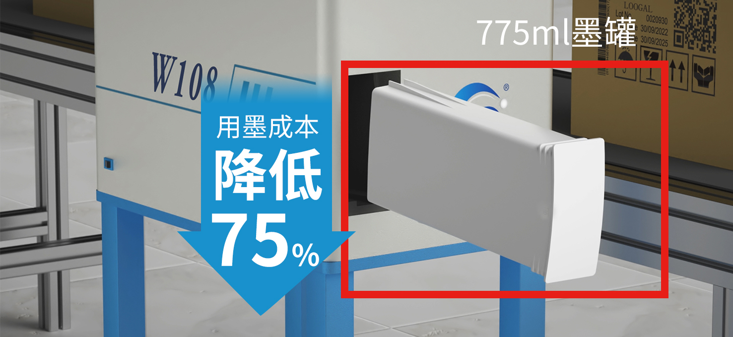 W108噴碼機(jī)配備775ml大墨盒,可以有效降低了用墨成本,幫助用戶(hù)實(shí)現(xiàn)成本控制。